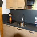 The apartment features an open-plan kitchen fully equipped with ceramic hobs, a combined oven, refrigerator, dishwasher, toaster, kettle, and coffee maker. The bathroom has a bathtub, and the toilet is separate. With its east-facing balcony offering a view of the slopes, this apartment provides a perfect setting for your ski or summer vacation.