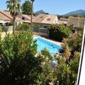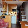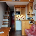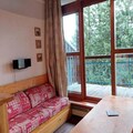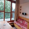 This cozy studio apartment, located in the Archeboc Residence, offers a comfortable stay for up to 5 guests. It features a living area with an 80x190 cm pull-out sofa bed, a mezzanine with a 140x190 cm double bed, and a sleeping nook with 2 80x190 cm bunk beds, separated by a curtain. The apartment is not pet-friendly, ensuring a peaceful environment for all guests. Bed and bathroom linen are available at an extra cost, and a deposit is required upon arrival.