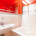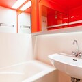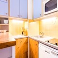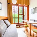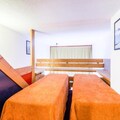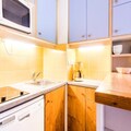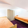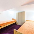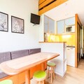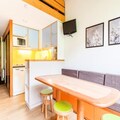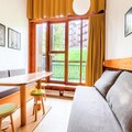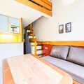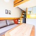 This cozy apartment accommodates up to 6 people, featuring a living room with a sofa bed and trundle bed, plus a mezzanine with 2 twin beds and 2 single beds. It is pet-friendly, with additional charges for pets. The living area includes a wooden dining table with 3 stools and 1 bench, while the bathroom has a bathtub and separate toilet. TV and storage options are available. Bed linen and towels can be provided for an extra cost, and housekeeping is optional, with a mandatory end-of-stay cleaning.