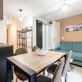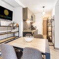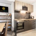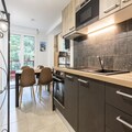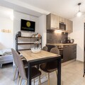 The apartment features an American-style kitchen with modern appliances like a fridge, stove, and microwave for easy meal prep. The bathroom is well-equipped with a hairdryer and ample storage. The residence offers a tranquil environment, perfect for unwinding after exploring nearby attractions.