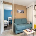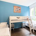 This 2-room apartment in a peaceful mountain residence accommodates up to 5 people. It features a living room with a standard sofa, a cabin area, and a bedroom with 3 single beds, plus a double bed in the cabin. The apartment also includes a bathroom with a shower, electric towel dryer, and a WC. Enjoy a balcony with a forest view, a parking space, and access to essential amenities like bed linen, towels, and Wi-Fi (extra charge). Pets are allowed for an additional fee, and baby kits are available on request.