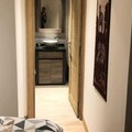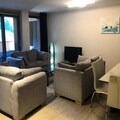 The apartment features a fully equipped kitchen with modern appliances, including a dishwasher, oven, microwave, coffee maker, and toaster. The bathroom includes a towel dryer and heated towel rail, with a separate toilet for added convenience. Additional services include concierge service, a TV lounge, and a NETSKI rental store. The "French Touch" grocery store offers takeaway meals, bread, and pastries delivered on order.