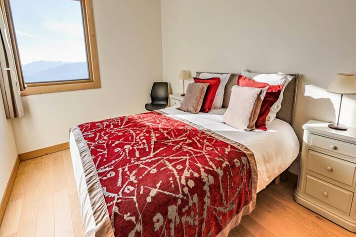 This 75m² luxury apartment in a 4-star residence accommodates up to 6 guests with two bedrooms, including a master with an en-suite, and a second bedroom with convertible beds. A mountain corner with bunk beds offers extra space. The apartment is non-smoking and pet-free. Amenities include beds made on arrival, towels, end-of-stay cleaning, and a private garage. Guests also enjoy free access to the wellness area with a pool, sauna, hammam, and gym.