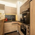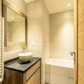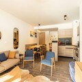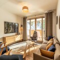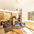 The apartment includes a fully equipped kitchen with an induction hob, dishwasher, microwave, fridge, and coffee makers. Enjoy a spacious living room with a 65-inch connected TV offering Apple TV and Netflix. The residence offers access to a wellness area with an indoor pool, spa, sauna, and gym, as well as ski lockers and concierge services.