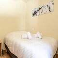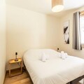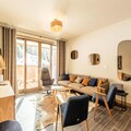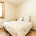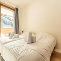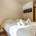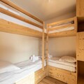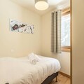 This luxurious 6-room apartment, located at the foot of the slopes, offers 106 m² of space for up to 12 people. It features 1 double bedroom (180x200 cm), 2 twin beds (90x190 cm), 1 double bed (180x200 cm), 2 sets of bunk beds (4 beds total), and a mountain corner with a double bed (140x190 cm). The apartment is non-smoking and pet-free, with underfloor heating, beds made on arrival, and bathroom linens included. Three covered parking spaces are available.