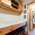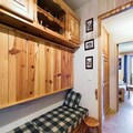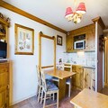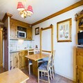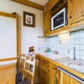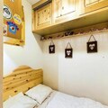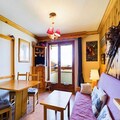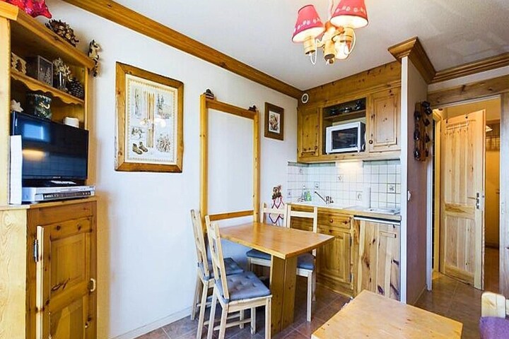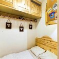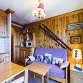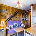 This 27m² studio cabin includes a mountain corner with a single folding bed, a shower room, and a separate toilet. The living room offers a convertible sofa for two people, while the kitchenette is equipped with 2 electric hotplates, a grill, and a refrigerator. The cabin also has a double bed in a separate sleeping area, providing ample space for guests. A flat-screen TV is provided for your entertainment, and the apartment includes a ski locker for storing equipment.