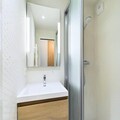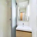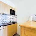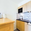 The studio comes equipped with a well-appointed kitchenette, featuring a ceramic hob, combined microwave oven, refrigerator, and dishwasher, making meal preparation a breeze. The bathroom includes a modern shower room with a towel dryer and a separate WC. End-of-stay cleaning, as well as the rental of sheets and towels, are available for an additional charge. Stay comfortable year-round with efficient heating, ensuring a cozy retreat after your outdoor adventures.