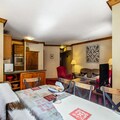 The apartment is equipped with a fully functional kitchen, making it easy to prepare meals. Two bathrooms ensure convenience for larger groups, and the separate WC adds to the comfort. Additionally, guests have access to a heated outdoor pool and wellness areas for ultimate relaxation. Paid parking is available with advance reservation for added convenience.