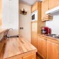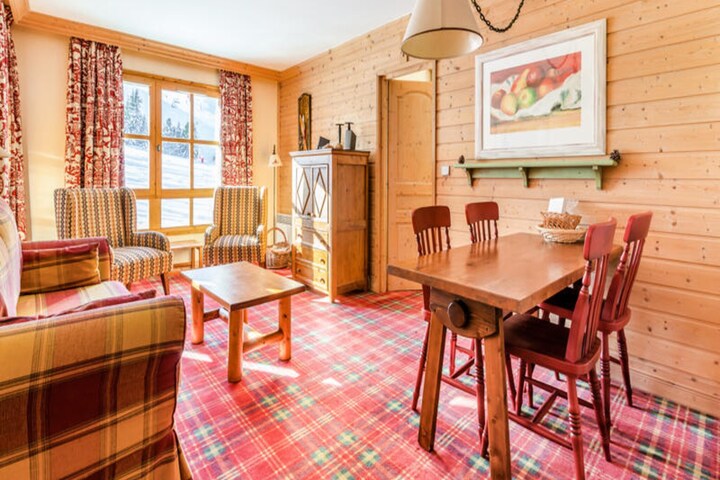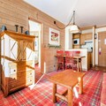 This charming apartment offers two cozy bedrooms, one with a double bed and the other with twin beds, making it ideal for families or small groups. The living area includes a sofa bed, two armchairs, and a pouf, along with a dining table for six. Pet-friendly accommodations are available on request. The apartment is fully equipped with a flat-screen TV, DVD player, and Bose speakers, ensuring a comfortable stay. Additional features include a ski locker and a safe for your convenience.