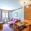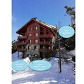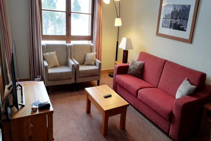 This spacious apartment features two bedrooms, one with a double bed and the other with two singles, perfect for families or small groups. The living area includes a sofa bed, two armchairs, and a dining table with seating for three. Enjoy a large balcony with stunning mountain views, ideal for relaxing after a day on the slopes. The apartment is pet-friendly with an additional fee and includes amenities like a ski locker, TV, Wi-Fi, and access to a shared heated outdoor pool.