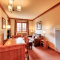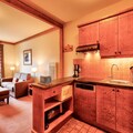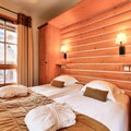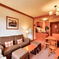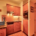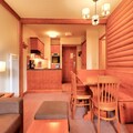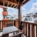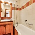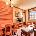 The apartment is fully equipped with a well-appointed American-style kitchen, featuring a dining table for six. The bathroom includes a bathtub with a shower column and additional conveniences like a hairdryer, heated towel racks, and ample storage space. A private parking space is available for your convenience. Guests can also enjoy access to a shared heated outdoor pool, while certain residences offer access to a heated indoor pool and spa facilities for relaxation after a day of adventure.