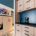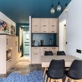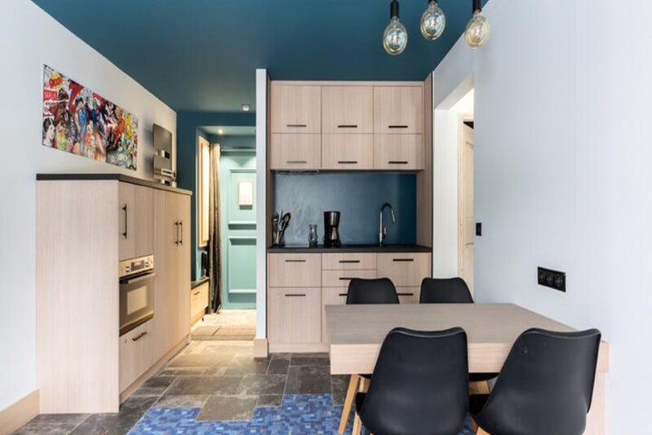 The apartment includes a fully equipped kitchen and a bathroom with a bathtub and separate toilet. Additional amenities include linens, towels, end-of-stay cleaning, and a baby kit (subject to availability). Access to the heated outdoor pool is included, with paid parking available nearby.