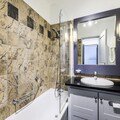 Inside, the apartment features a fully equipped kitchen, ideal for preparing meals, and a spacious bathroom with both a bathtub-shower combination and a separate WC. A second shower room is also available for added convenience. Guests can enjoy communal amenities such as heated outdoor pools and access to wellness facilities like a sauna and fitness room, depending on the building. A parking space is available for an additional fee, and housekeeping services are included.
