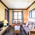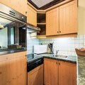 The apartment is fully equipped for self-catering with a kitchen that opens into the living space. There are two bathrooms: one with a bathtub-shower combination and the other with a shower. Additional amenities include towels, housekeeping services, and access to the communal heated outdoor pool, sauna, and fitness center. Parking is available for an additional fee, and there is a baby kit available upon request.