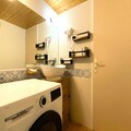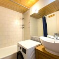 Inside, the 45m² apartment is thoughtfully designed to accommodate up to six guests. The living room features a comfortable sofa bed, while the bedroom offers a snug double bed for restful nights. A separate sleeping area with bunk beds adds flexibility, making it ideal for families or groups of friends. The fully equipped kitchen, complete with an electric stovetop, oven, microwave, dishwasher, and refrigerator, ensures you can prepare hearty meals after a day of adventure. A bathroom with a bathtub and a separate toilet add to the convenience, while a television and pet-friendly policy make it feel like home.