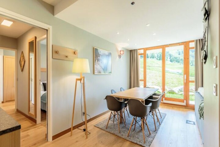 High above the vibrant Arc 1800, this elegant 4-star apartment in the Les Monarques residence offers a luxurious alpine escape with ski-in/ski-out convenience and breathtaking views from its south-facing terrace. Whether you're here to carve through Paradiski’s 425 km of pristine slopes or to enjoy summer hikes in the legendary Vanoise National Park, this property is perfectly situated for year-round adventures. The residence itself boasts premium amenities, including a swimming pool, spa with hammam, sauna, and jacuzzi, as well as a fitness room to ensure relaxation and rejuvenation after an active day in the mountains.\n\nSpanning 85 square meters, the apartment comfortably accommodates up to six guests with three thoughtfully designed bedrooms, including a master suite with en-suite bathroom. The open-plan living area invites you to unwind with plush seating, a Bose Hi-Fi system, and modern entertainment options. The fully equipped kitchen features high-end appliances such as a dishwasher, oven, microwave, and Nespresso coffee maker, making it easy to prepare meals and snacks. Additional conveniences include Wi-Fi, a ski locker, and a covered parking space.\n\nLocated in the exclusive Le Chantel area, the residence is just minutes from Edenarc’s Nama Springs Spa, gourmet grocery store, and the Dahu cable car, which connects you to the Arc 1800 snow front and resort center in under three minutes. A free shuttle service nearby provides easy access to the village’s lively restaurants, shops, and après-ski venues. In summer, the golf course and scenic trails are right at your doorstep.\n\nWhether you’re seeking thrilling winter sports, serene summer landscapes, or indulgent spa days, this apartment offers the perfect blend of comfort, style, and convenience for an unforgettable mountain getaway.