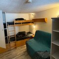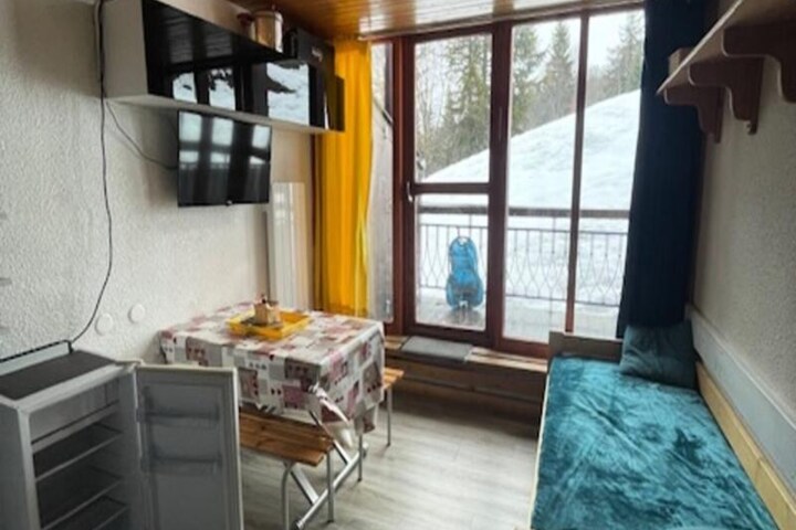 In the serene Charmettoger area of Les Arcs 1800, this cozy duplex apartment offers a tranquil alpine retreat with direct access to the slopes. Imagine waking up to the crisp mountain air and stepping onto your northeast-facing balcony to admire the breathtaking views of Aiguille Grive. Whether you're here for winter skiing or summer hiking, this residence provides the perfect base for exploring the beauty of the French Alps. The peaceful surroundings ensure a relaxing stay, away from the bustle of the busier resort areas. \n\nDesigned to accommodate up to five guests, the apartment combines comfort and practicality. The mezzanine studio layout includes a welcoming living room with a dining table and sofa bed, a fully equipped kitchenette with modern appliances such as a mini oven, microwave, refrigerator, and dishwasher, and a bathroom with a bathtub and toilet. Upstairs, the mezzanine features two single bunk beds and a sofa bed, while a separate bedroom with a double bed and TV offers additional privacy. Eco-friendly linens and end-of-stay cleaning services are available for added convenience, ensuring a sustainable and stress-free holiday experience. \n\nThe residence is ideally situated at the foot of the slopes, making it easy to start your day of skiing or snowboarding without delay. For those seeking local amenities, a grocery store is conveniently located within the residence, while covered parking at Charmettoger and free roadside parking provide practical options for travelers. The inter-resort shuttle stop at Charmettoger connects you effortlessly to other areas of Les Arcs, enhancing your alpine adventure. \n\nWhether you're drawn by the thrill of the slopes, the charm of the mountain trails, or simply the desire to unwind in a peaceful setting, this apartment offers the perfect blend of comfort, location, and accessibility. Make unforgettable memories surrounded by the majestic peaks of the Tarentaise Valley.