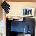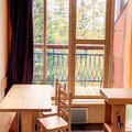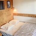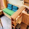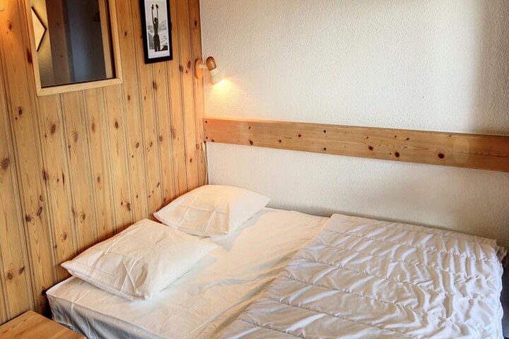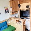 Inside, the apartment is thoughtfully designed to accommodate up to four guests. The entrance hall leads to a bathroom with a bathtub and toilet, while the fully equipped kitchenette features three electric burners, an oven, a refrigerator, and a dishwasher—perfect for preparing hearty meals after a day on the slopes. The living room, complete with a dining table and a comfortable bench seat, provides a welcoming space to unwind. Upstairs, the mezzanine offers two staggered single beds, a cozy relaxation area with an armchair, and a television. A separate bedroom with a double bed ensures restful nights for all.
