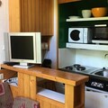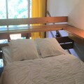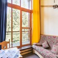 The 30m² studio is thoughtfully designed to maximize comfort and functionality. The entrance hall leads to a bathroom with a bathtub and toilet, while the fully equipped kitchenette includes three electric burners, an oven, microwave, refrigerator, and dishwasher—perfect for preparing meals after a day on the slopes. The living room features a comfortable sofa bed and TV, creating a cozy space to unwind. Upstairs, the mezzanine offers a single bed and a separate area with a double bed, which can be closed off for privacy with a hinged door. The north-facing balcony provides a quiet spot to enjoy the crisp mountain air.