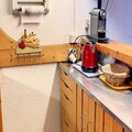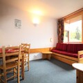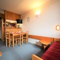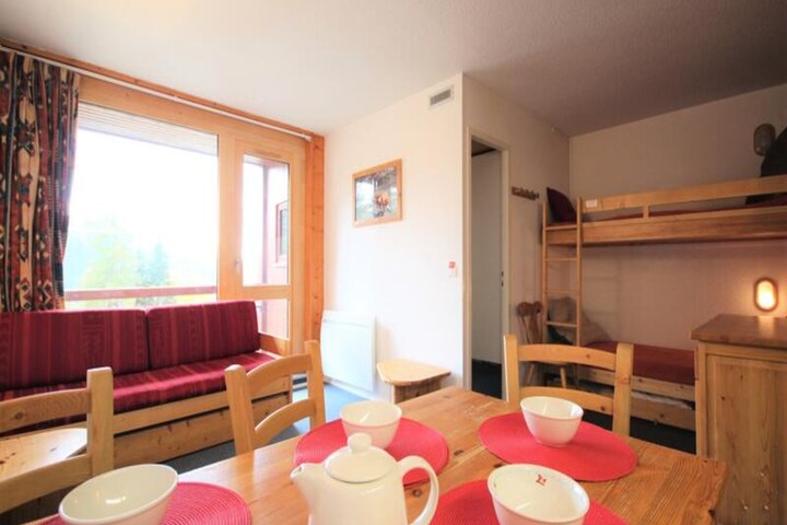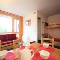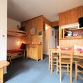 High above the bustling heart of Les Arcs 1800, this charming apartment offers a serene retreat with breathtaking views of the valley and surrounding mountains. As the sun sets over the Tarentaise, the southwest-facing balcony becomes the perfect spot to unwind, offering a panorama of golden hues and alpine tranquility. Whether you’re seeking adventure or relaxation, this residence is your gateway to the French Alps. \n\nInside, the apartment is thoughtfully designed to accommodate up to six guests. The cozy bedroom features a comfortable double bed, while the sleeping alcove with bunk beds is ideal for children or friends. The bright living room, with its daybeds and family dining table, invites you to share meals and moments together. The open-plan kitchen is fully equipped with modern appliances, including an electric stovetop, oven, refrigerator, and dishwasher, ensuring you have everything you need for a comfortable stay. The bathroom with a bathtub and the separate toilet add convenience to your alpine escape. \n\nSituated in the quiet Villards area, the residence is just steps away from essential amenities. Covered parking, outdoor options, and free roadside parking make arrival easy, while the nearby shuttle stop connects you to the wider Les Arcs region. In winter, the slopes are within easy reach, and in summer, the area transforms into a haven for hikers, cyclists, and nature enthusiasts. Free Wi-Fi ensures you stay connected, while eco-friendly linens and cleaning services add a touch of sustainability to your stay. \n\nWhether you’re here to carve through pristine snow or explore lush mountain trails, this apartment offers the perfect balance of comfort, convenience, and stunning alpine beauty. Let the magic of Les Arcs 1800 create unforgettable memories for you and your loved ones.