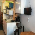 Designed for comfort and convenience, the 19m² studio accommodates up to three guests. The cabin area at the entrance features a snug single bed, while the living room includes a comfortable sofa bed, a small dining table, and a flat-screen TV for cozy evenings. The kitchenette is equipped with electric stovetops, a microwave, and a refrigerator, making it easy to prepare meals after a day of adventure. The northeast-facing balcony offers a tranquil spot to unwind, with views of the surrounding mountains and fir trees. Free Wi-Fi ensures you stay connected during your stay, and eco-friendly linens and cleaning services are available for an additional fee.