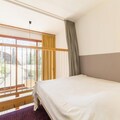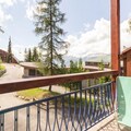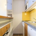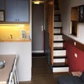 Designed for up to five guests, the apartment features a thoughtful layout that combines comfort and functionality. The entrance hall leads to a fully equipped kitchen with modern appliances, including ceramic hobs, a microwave/grill, a refrigerator, a dishwasher, and an electric coffee maker. The living room, with its single bed and TV, is a cozy space to unwind after a day on the slopes. Upstairs, the mezzanine offers a sleeping alcove with bunk beds and a bathroom, while a separate bedroom with two single beds overlooks the living area. The southwest-facing balcony is the perfect spot to relax and take in the stunning alpine scenery.