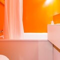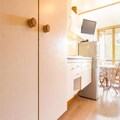 Designed to comfortably accommodate up to four guests, the studio features a practical layout with a pull-out sofa bed in the living room and an additional sofa bed in the sleeping alcove near the entrance. The fully equipped kitchen includes an electric stovetop, mini oven, refrigerator, combination microwave, and dishwasher, making it easy to prepare meals and enjoy cozy evenings in. A flat-screen TV adds to the comfort, while eco-friendly linens and end-of-stay cleaning services are available for an additional fee, ensuring a hassle-free stay.