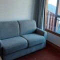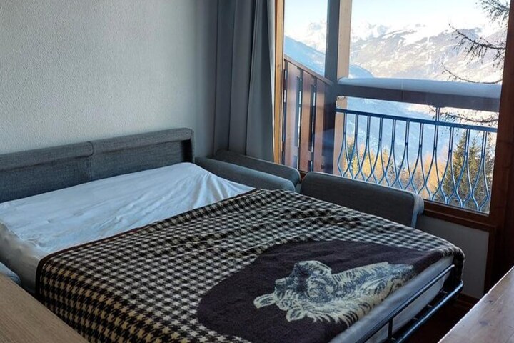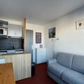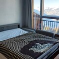 The apartment, located on the fifth floor of a residence with an elevator, is thoughtfully designed to accommodate up to four guests. The living room features a comfortable sofa bed, while the separate bedroom offers bunk beds, perfect for families or small groups. The fully equipped kitchen, complete with an induction hob, combination oven/microwave, and dishwasher, makes it easy to prepare meals after a day of outdoor activities. A west-facing balcony invites you to relax and soak in the mountain views, while modern amenities like a television and ski locker add to your convenience.