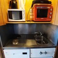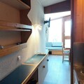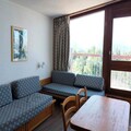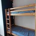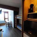 Inside, the 25m² studio is thoughtfully designed to maximize comfort and functionality. The living area features two single beds, while a sleeping alcove with bunk beds provides additional space, making it ideal for families or small groups. The fully equipped kitchen includes electric hobs, a combination oven/microwave, a dishwasher, and a refrigerator, ensuring you have everything needed to prepare hearty meals after a day of adventure. A bathroom with a bathtub and toilet adds to the convenience, while the living room’s television offers a cozy spot to unwind.