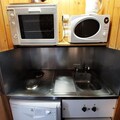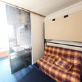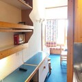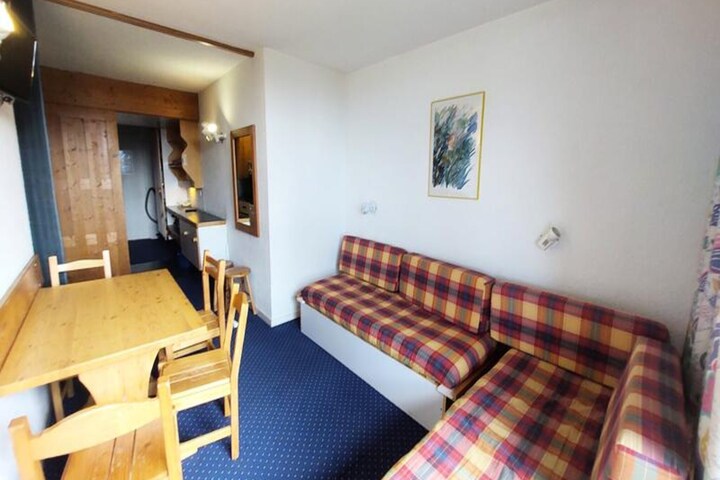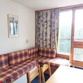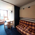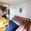 This 25m² studio, situated on the 8th floor with elevator access, comfortably accommodates up to four guests. The living area features two single beds, while a sleeping alcove offers a double sofa bed, ensuring restful nights after active days. The southwest-facing balcony provides stunning views of the resort and mountains, perfect for enjoying a morning coffee or an evening sunset. The fully equipped kitchen includes an electric stovetop, oven, microwave, refrigerator, and dishwasher, making meal preparation a breeze. A bathroom with a bathtub and toilet adds to the convenience, and a television in the living room ensures entertainment for cozy evenings indoors.