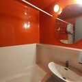 Designed to accommodate up to four guests, the studio features a cleverly arranged living area with a single bed and trundle bed, as well as a sleeping alcove with similar arrangements. The fully equipped kitchen includes an electric stovetop, oven, microwave, dishwasher, and refrigerator, making it easy to prepare hearty meals after a day of activity. The bathroom offers a bathtub and toilet, while the living room is equipped with a television for your relaxation. With its warm and functional design, this apartment ensures a comfortable stay for families or small groups.