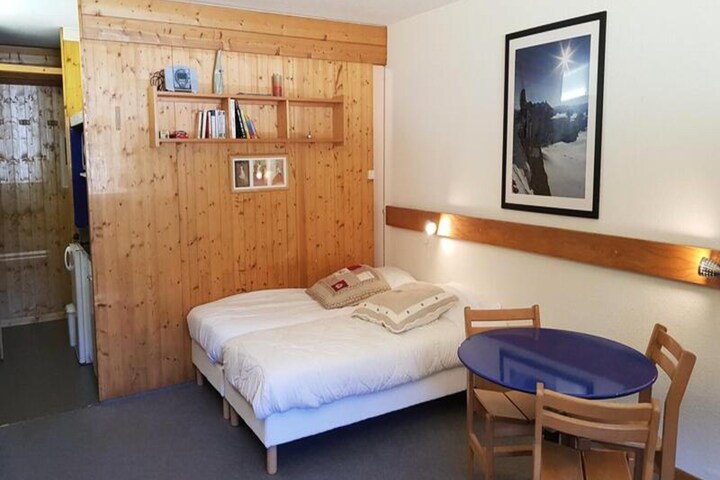 High in the heart of the French Alps, this charming studio in Arc 1600 offers a cozy retreat for couples or small groups seeking an unforgettable mountain getaway. With its northern exposure and prime location at the foot of the slopes, this residence ensures effortless access to world-class skiing and year-round alpine adventures. Whether you’re here to carve through fresh powder or explore scenic trails in the summer, every moment is framed by the breathtaking beauty of the surrounding peaks. \n\nThe studio, measuring 23m², is thoughtfully designed to accommodate up to three guests. Inside, you’ll find a comfortable living area featuring two single beds and a bunk bed, perfect for relaxing after a day of outdoor activities. The kitchenette is equipped with electric hobs, a microwave, and a refrigerator, allowing you to prepare simple meals with ease. Additional amenities include a television, free Wi-Fi, and a ski locker, ensuring both convenience and comfort throughout your stay. The residence welcomes pets, making it an ideal choice for travelers with furry companions. \n\nStep outside and discover the vibrant resort center just a short walk away. Here, you’ll find a variety of shops, restaurants, and après-ski options to enhance your holiday experience. In summer, the region transforms into a haven for hikers, cyclists, and nature enthusiasts, with trails that wind through lush landscapes and offer stunning views of the Tarentaise Valley. Shared parking nearby adds to the practicality of this well-situated property. \n\nWhether you’re seeking thrilling winter sports or tranquil summer escapes, this studio in Arc 1600 combines comfort, convenience, and alpine charm to create the perfect base for your adventures. Book now and immerse yourself in the magic of the French Alps.