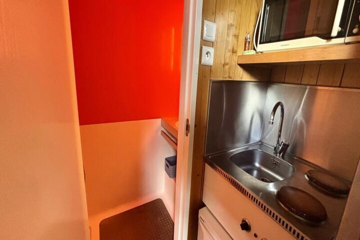Situated in the vibrant Villards neighborhood of Les Arcs 1800, this cozy studio apartment offers a welcoming retreat for couples seeking a mountain getaway. Positioned on the 10th floor of the Nova 3 residence, the property boasts a north-facing view of serene fir trees, creating a tranquil atmosphere amidst the lively resort. With ski-in/ski-out access, you can step directly onto the slopes and immerse yourself in the renowned Paradiski domain, promising endless alpine adventures. Whether you’re here to ski, hike, or simply relax, this location places you at the heart of it all. \n\nThe apartment is thoughtfully designed with a compact yet functional layout, featuring a living room equipped with a sofa bed and a trundle bed that converts into a comfortable double bed. The kitchenette includes essential amenities such as electric burners, a microwave, refrigerator, toaster, kettle, and coffee maker, making it easy to prepare meals after a day of exploration. The small boat-style shower stall and separate toilet add to the practical convenience, while free Wi-Fi ensures you stay connected throughout your stay. \n\nStep outside and discover the resort’s bustling atmosphere with its array of shops, restaurants, and après-ski options just a short walk away. The inter-resort shuttle stops nearby, providing easy access to other areas, while covered parking and free roadside spaces offer flexibility for those arriving by car. In summer, the region transforms into a haven for outdoor enthusiasts with hiking trails, mountain biking, and breathtaking views of the Tarentaise Valley. \n\nWhether you’re drawn to the thrill of winter sports or the serenity of summer landscapes, this charming studio promises a memorable escape in the heart of the French Alps.