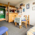 Imagine waking up in the heart of Les Arcs 1800, where the crisp alpine air and breathtaking views of the valley greet you each morning. This charming one-bedroom apartment, nestled in the Tournavelles 2 residence, offers a cozy retreat for up to five guests. With its southwest-facing balcony, you’ll enjoy stunning sunsets over the valley, creating the perfect backdrop for a relaxing getaway in the French Alps. Located just above the bustling Village des Villards shopping mall, everything you need is right at your doorstep. \n\nStep inside this thoughtfully designed 33m² apartment and discover a warm and inviting space. The private bedroom features three single beds, including two bunk beds, while the living room offers a comfortable sofa bed and a television for cozy evenings in. The open-plan kitchenette is equipped with all the essentials, including an electric stovetop, mini oven, refrigerator, microwave, and dishwasher, making it easy to prepare meals after a day of adventure. The bathroom includes a bathtub for a soothing soak, and the separate toilet adds convenience for families or groups. \n\nPerfectly positioned at the foot of the slopes, this residence provides unparalleled ski-in/ski-out access, ensuring you can hit the slopes with ease. The nearby inter-resort shuttle stop at Villards train station makes exploring the area effortless. In addition to skiing, the vibrant resort offers a variety of shops, restaurants, and après-ski activities to enjoy. During the summer months, Les Arcs transforms into a haven for hikers and mountain bikers, with trails that wind through the stunning Tarentaise Valley. \n\nWhether you’re seeking thrilling winter sports or serene summer escapes, this eco-friendly apartment is your gateway to unforgettable alpine adventures. With optional linens and end-of-stay cleaning available, your stay is as convenient as it is memorable. Let the magic of Les Arcs 1800 captivate you and create memories that will last a lifetime.