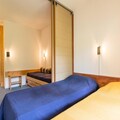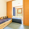The 40m² duplex is thoughtfully designed to accommodate up to six guests. The main floor features a welcoming living area with a sofa bed, a dining table, and a TV, creating a cozy space to relax after a day of adventure. The adjoining kitchen is equipped with modern amenities, including a refrigerator, mini oven, dishwasher, and coffee maker, making it easy to prepare hearty meals. Upstairs, you'll find a hallway with bunk beds (note: the top bunk is not suitable for children under six), a bathroom with a bathtub and toilet, and a sleeping area with a trundle bed and three single beds, separated by a sliding partition for added privacy.
