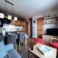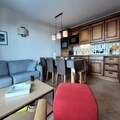 Inside, the apartment is thoughtfully designed to accommodate up to six guests. The living and dining area features a comfortable 140cm sofa bed and a TV, creating a warm and inviting space to unwind. The master bedroom boasts a plush double bed (160cm) and an en-suite shower room, while a second bedroom offers another double bed (160cm). The fully equipped kitchen includes modern appliances such as induction hobs, an oven, a microwave, a refrigerator, a dishwasher, and more—everything you need to prepare hearty meals after a day on the slopes. Additional amenities include a ski locker, covered parking, and bed linens provided for your convenience.