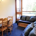 Designed to comfortably accommodate up to four guests, the studio features a thoughtfully arranged mountain corner with two bunk beds and a living area equipped with two sofa beds. The kitchenette is compact yet fully equipped, including two electric burners, a mini-oven, microwave, dishwasher, and more—ideal for preparing hearty meals after a day on the slopes. The northeast-facing balcony provides a tranquil spot to unwind, offering panoramic views of the majestic landscape. Modern amenities such as free resort Wi-Fi and a flat-screen TV ensure a comfortable and connected stay, while eco-friendly linens and end-of-stay cleaning are available for added convenience.