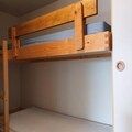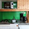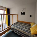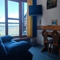 Inside, the 39m² apartment is thoughtfully designed to accommodate up to six guests. The living room features a cozy double sofa bed, while the mezzanine offers a double bed and a sleeping alcove with bunk beds, perfect for families or groups of friends. A fully equipped kitchen, complete with a refrigerator, dishwasher, and combi-grill microwave, invites you to prepare hearty meals after a day of exploration. Relax in the living room with a TV or step out onto the southwest-facing balcony to soak in the mountain views.