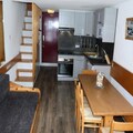 Inside, the 39m² apartment is thoughtfully designed to accommodate up to six guests comfortably. The upper floor features three cozy sleeping areas, including a double bedroom, a twin room, and a charming alcove with bunk beds, perfect for families or groups of friends. The fully equipped kitchen, complete with ceramic hobs, an oven, and a dishwasher, opens into a welcoming living room, making it easy to prepare meals and relax after a day of exploration. Modern conveniences such as a television and a secure ski locker ensure a stress-free stay.