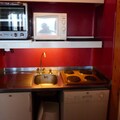 Step inside and discover a thoughtfully designed space that comfortably accommodates up to five guests. The living room features two single beds, while the bedroom offers a unique set of three bunk beds, perfect for families or small groups. The fully equipped kitchen, complete with electric hobs, an oven, refrigerator, dishwasher, and more, opens onto the living area, creating a welcoming space to share meals and memories. Modern amenities such as Wi-Fi and a flat-screen TV ensure your comfort after a day of exploration.