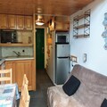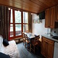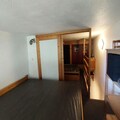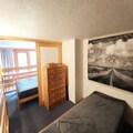 Designed to accommodate up to four guests, the 25m² apartment features a mezzanine with a double bed and two single trundle beds, separated by a sliding door for added privacy. The open-plan kitchen is fully equipped with modern appliances, including a ceramic hob, microwave, oven, dishwasher, and more, making it easy to prepare meals after a day on the slopes. The living room, complete with a television, creates a welcoming space to relax and unwind. A bathroom with a bathtub and toilet ensures comfort during your stay, while two secure ski lockers on the same landing provide convenient storage for your gear.