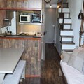 This 35m² apartment, located on the 4th floor of a building with an elevator, comfortably accommodates up to five guests. The extended mezzanine features a private bedroom with a double bed, a sleeping alcove with bunk beds, and a trundle bed, making it ideal for families or small groups. The open-plan kitchen, fully equipped with modern appliances including a dishwasher and oven, flows seamlessly into the living area, where a television and cozy seating await. A bathroom with a bathtub and an additional separate toilet on the mezzanine ensure convenience for all guests.