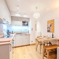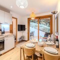 The apartment is equipped with a fully functional kitchen that includes modern appliances such as an induction hob, oven, refrigerator, dishwasher, washing machine, toaster, kettle, and coffee maker. This setup allows for a self-sufficient stay, with all the necessary tools for preparing meals. Additional amenities include a shower room with a toilet, storage space for ski gear, and a bag of cleaning products to help guests maintain the apartment during their stay. With its thoughtfully designed layout and convenient location, this apartment offers a balanced mix of comfort and practicality for both short and extended stays.