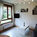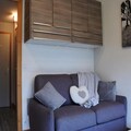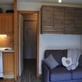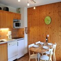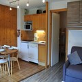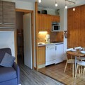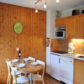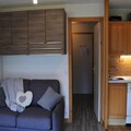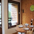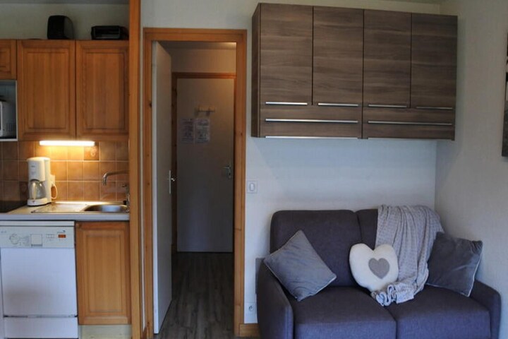 It comfortably accommodates up to 4 guests, featuring a well-equipped kitchenette with an induction hob, dishwasher, microwave, refrigerator, and essential appliances like a coffee maker, raclette machine, fondue set, kettle, and toaster. The living area includes a sofa bed and opens onto a balcony or terrace, perfect for enjoying the fresh mountain air. A dedicated mountain area with bunk beds offers additional sleeping space. The apartment also includes a bathroom, separate toilet, and a ski locker for your convenience.