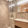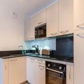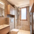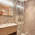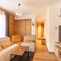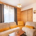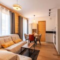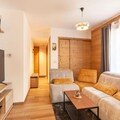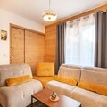 The apartment's open-plan living area includes a fully equipped kitchen with modern appliances, such as a refrigerator, oven, and microwave, ideal for self-catering. A ski locker and a cellar for bicycles provide secure storage for equipment. The apartment’s design includes a contemporary bathroom with a shower and WC. Heating is available throughout the property, ensuring guests’ comfort during their stay in all seasons.