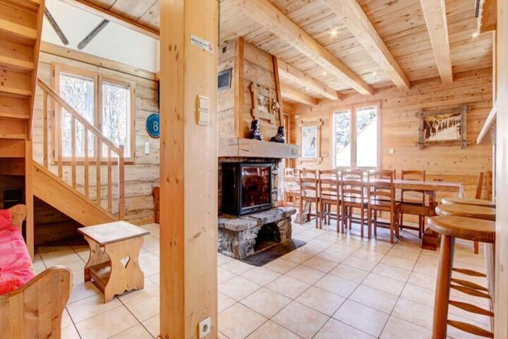 This spacious 100m² triplex apartment accommodates up to 12 guests. It features a cozy living room with a fireplace, TV, and a balcony, plus a dining area connected to the kitchen. The property includes three outdoor parking spaces, a ski storage area with a shoe dryer, and offers essential services like end-of-stay cleaning and linens. Pets are not allowed.