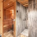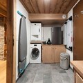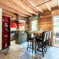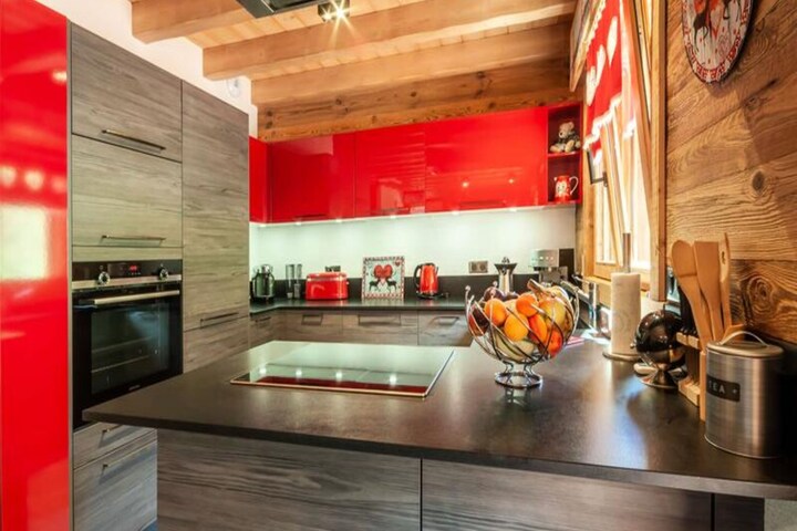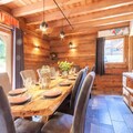 The well-equipped kitchen opens onto a spacious dining area, with modern appliances such as a raclette machine, fondue set, and a stone grill for cooking. In addition, a BBQ is provided for outdoor cooking during warmer months.