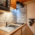 The studio comes with a fully equipped kitchenette, including essential appliances for preparing meals. Guests also have access to an internet box for rent at an additional fee, ensuring connectivity during their stay.