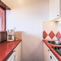 The apartment features a fully equipped kitchen with a fridge, microwave, and cooking utensils. The living area offers a comfortable space to relax with a TV. The bathroom includes a shower, and a washing machine is available for laundry. Nearby parking is available, and reservations are required.