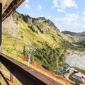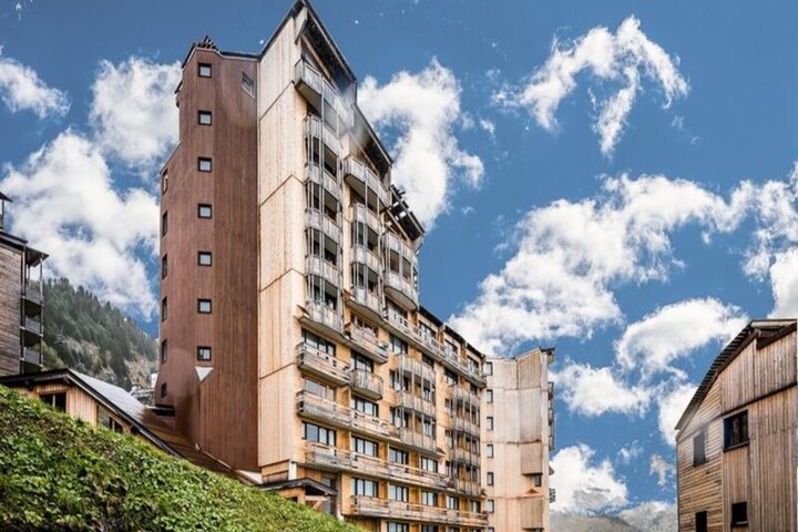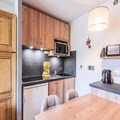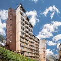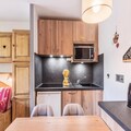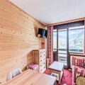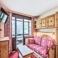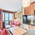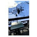 The apartment features a fully equipped kitchen area with a stove and fridge, ideal for preparing your meals. The spacious balcony with a table and chairs offers a scenic mountain view, perfect for relaxing after a busy day. Guests also enjoy convenient access to a ski locker, elevator, and a reserved parking space in nearby parking facilities.